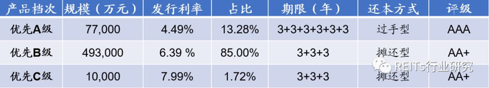 该产品针对酒店资产的经营特性作了结构化分层安排,优先A类证券规模为7.7亿元,期限约18年,每3年末附票面利率调整权和投资者回售权,中诚信给予AAA的信用评级;而优先B类和优先C类的规模分别为49.3亿元和1.0亿元,期限均为9年,每3年末附票面利率调整权和投资者回售权,中诚信给予AA+的信用评级。