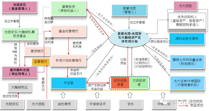 光控安石设立“首誉光控大融城私募投资基金”,并由上海雷泰(原始权益人)认缴25亿元获得全部私募基金份额。首誉光控(计划管理人)设立专项计划,以募集资金购买取得上海雷泰所持私募基金的全部基金份额。