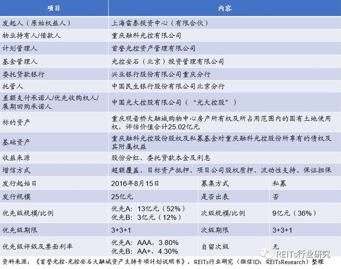 2016年8月5日,首誉光控资产管理有限公司(“首誉光控”)成功设立准REITs型资产证券化产品“首誉光控-光控安石大融城资产支持专项计划”。该专项计划产品规模达25亿元人民币,以光大安石(北京)房地产投资顾问有限公司(“光大安石投资”)旗下管理购物中心“大融城”系列之旗舰产品“重庆观音桥大融城购物中心”作为底层物业资产,以未来租金及其他经营收入带来的现金流为还款来源。