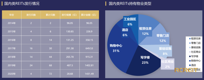 根据RCREIT(REITs研究中心)数据,截至2020年5月9日,国内已发行类REITs产品72只,发行规模合计1431.49亿元。