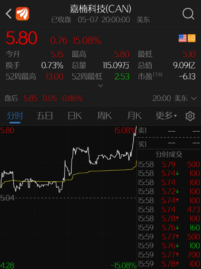 受比特币价格回暖的消息影响,在美股上市的中概股、全球第二大矿机生产商嘉楠科技5月7日大涨15%。