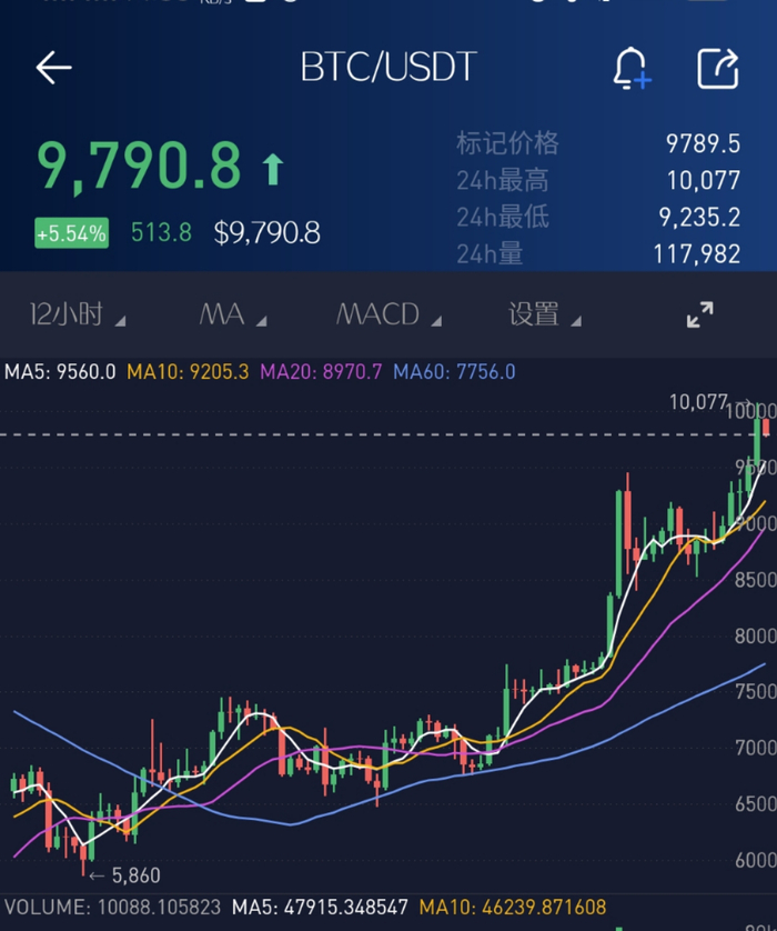经历三月下旬的暴跌洗礼后,比特币又卷土重来,5月8日早间,比特币价格突破1万美元。截至5月9日晚21时,比特币继续在1万美元附近缩量震荡,5月9日小幅调整2%,价格接近9700美元。
