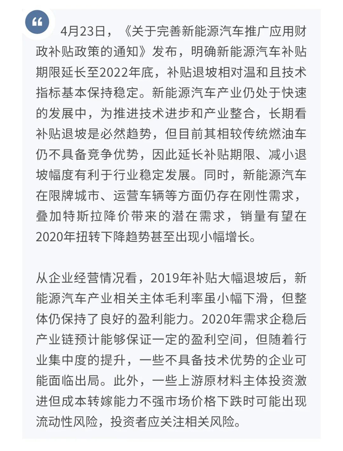 整体看,新能源汽车产业仍处于快速的发展中,为推进技术进步和产业整合,补贴退坡是必然趋势。但目前新能源汽车相较传统燃油车仍不具备竞争优势,因此延长补贴期限,减小退坡幅度有利于行业稳定发展。新能源汽车在限牌城市、运营车辆等方面仍存在刚性需求,叠加特斯拉降价带来的潜在需求,销量有望在2020年扭转下降趋势甚至出现小幅增长。从企业经营情况看,2019年补贴大幅退坡后,新能源汽车产业相关主体毛利率虽小幅下滑,但整体仍保持了良好的盈利能力。2020年需求企稳后产业链整体能够保持一定的盈利空间,但随着行业集中度的提升,一些不具备技术优势的企业可能面临出局,同时部分上游原材料主体投资激进但成本转嫁能力不强市场价格下跌时可能出现流动性风险,投资者应关注相关风险。