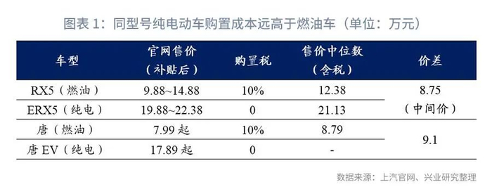 纯电汽车购置成本远高于燃油车,且短期难有改善。新能源汽车消费成本包括购置成本和使用成本两部分,目前纯电动汽车平均购置成本扔远高于燃油车,但较低的电价使得其使用成本低于燃油车。新能源汽车成本较高的原因在于:1、电池等成本相对刚性,保证续航里程的前提下整车成本下探空间较为有限,中低端产品没有价格优势;2、发展时间短、技术迭代快,单一产品销售规模小,难以摊薄研发成本及期间费用。因此新能源汽车产业的特性决定了其产品的购置成本高于燃油车,且短时间难以扭转。以自主品牌同一车型为例,购置税优惠后上汽SUV车型RX5燃油和纯电版本入门级别价差9.0万元,中间价价差8.75万元;比亚迪唐入门级价差则为9.10万元,整体价差均超过8.5万元,纯电车型售价接近燃油车型底价的2倍。