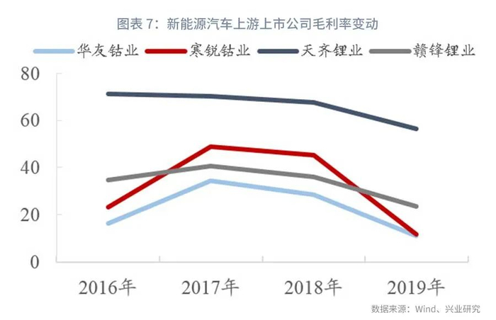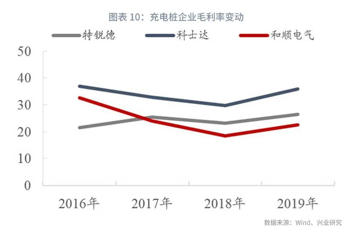 2019年行业补贴退坡缺口主要由上游和整车企业消化。新能源汽车上游主要是镍、钴、锂等正负极材料和电解液、隔膜等供应商;中游主要是三电系统(电池、电机、电控)及其他零部件供应商;下游主要包括整车厂和充电桩企业。从毛利率水平看,上游原料供应商相对分散,成本转嫁能力最弱,2019年补贴大幅退坡后毛利率下行水平最大。中游的三电企业各自均有一定的技术壁垒,成本转嫁能力相对较强,毛利率下行幅度有限,且随着营收规模增长多数企业利润仍保持增长。充电桩企业经营主要受存量新能源汽车数量影响,市场销量下行情况下毛利率仍整体出现了增长。补贴退坡下整车毛利必然受到压缩,预计也吸收了一部分的补贴退坡缺口,但整车企业本身传统业务体量较大,吸收了新能源汽车销量下滑的影响,也从侧面反映了目前产业政策整车企业通过燃油车利润补贴新能源汽车发展的整体趋势。