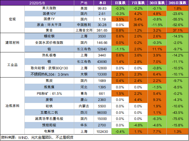 5月8日美元指数环比下跌0.3%;十年期国债环比下跌0.3%;一年期国债上涨3.5%;原油价格环比持平;黄金价格环比上涨0.8%;螺纹钢价格3530元/吨,环比上涨0.6%;热轧板卷环比上涨0.6%;PB粉矿:61.5%环比上涨1.5%;焦炭价格环比上涨0.4%;全国水泥价格指数环比持平;废钢价格环比持平;电解铝价格环比下跌1.1%;电解镍价格环比下跌0.4%。