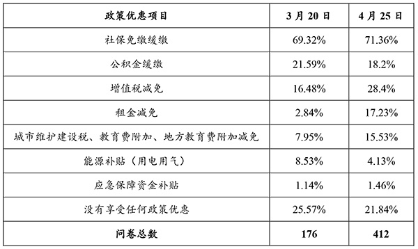 )。调查结果显示,目前社保免缴缓交政策落实的效果较好,两次调研均有70%左右的企业获得了优惠,其次是公积金缓交政策和增值税减免政策,但享受了这些政策的企业也仅有两成左右。从两次调研的结果来看,租金减免政策似乎有了较大的进步,享受到该政策的企业比重从2.84%上升到17.23%(也有可能和样本的偏差有关)。