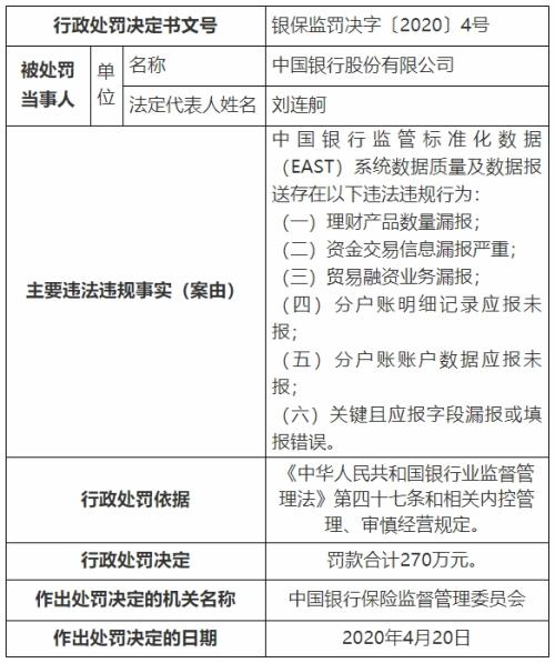 中国银行上述系统数据质量及数据报送亦存在多项违法违规行为,包括理财产品数量漏报、资金交易信息漏报严重、贸易融资业务漏报等。根据《中华人民共和国银行业监督管理法》第四十六条和相关内控管理、审慎经营规定,银保监会对其处以罚款合计160万元。