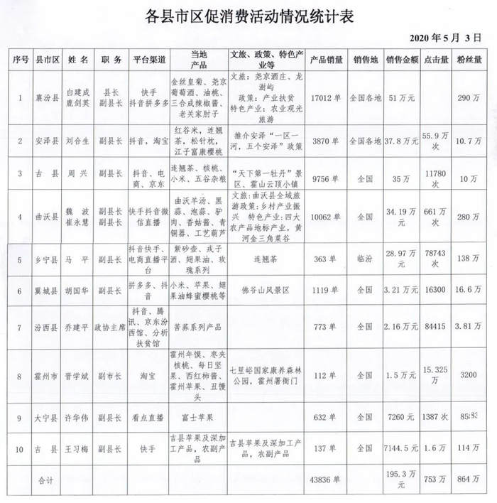 5月3日临汾各县(市、区)领导直播带货统计表 微信公众号@临汾广播电视台 图