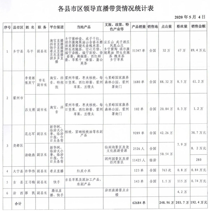 5月4日,临汾共有6个县(市、区)开展了领导带货直播活动,当日销售额192.4万元。其中,位列榜首的是乡宁副县长马平,销售51347单,销售金额89.4万元;排名第2的是霍州市长李青雁、副市长张发宁、副市长吕文博,销售1782单,销售金额62.4万元。