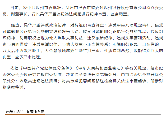 更早一天,浙江省纪委省监委网站官方微信公众号“清廉浙江”就发文称,经中共温州市委批准,温州市纪委市监委对温州银行股份有限公司原党委委员、副董事长、行长吴华严重违纪违法问题进行纪律审查、监察调查。