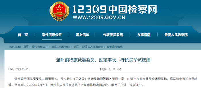 5月8日,中国检察网消息,温州银行原党委委员、副董事长、行长吴华(正处级)涉嫌受贿罪等职务犯罪一案,由温州市监察委员会调查终结,移送检察机关审查起诉。