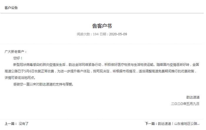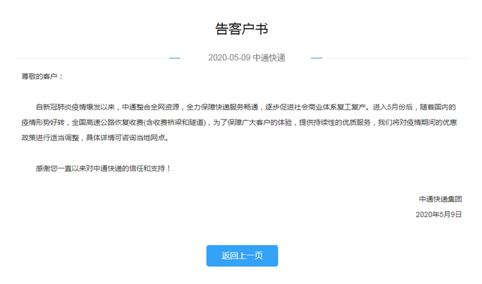 8日,圆通称,随着国内疫情防控局面向好,根据交通运输部统一部署,全国范围内的收费公路(含收费桥梁和隧道)2020年5月6日零时恢复收费。为保障广大客户体验,提供持续优质的服务,促进基层网点良性发展,将适当调整快递服务价格优惠幅度。