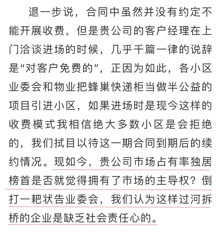 对小区业委会和物业来说,快递柜企业当初上门求合作时“嘴比蜜甜”,如今收费却“单方拍板”,这明显与快递柜是为居民免费提供便利的入驻初衷相违背。