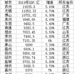 第一财经记者梳理了2019年普通地级市GDP20强,其中排名前19位的城市均超过了5000亿元大关,更有3个城市进入到GDP万亿俱乐部行列,分别是苏州、无锡和佛山。