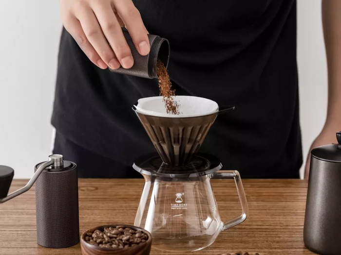 湿润滤纸后,就可以将研磨好的咖啡粉,倒入滤杯。