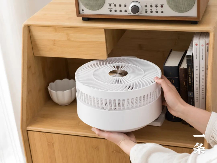 折叠起来还没你家里的脸盆大,往上一掰,就变成了一个高颜值桌面电风扇。