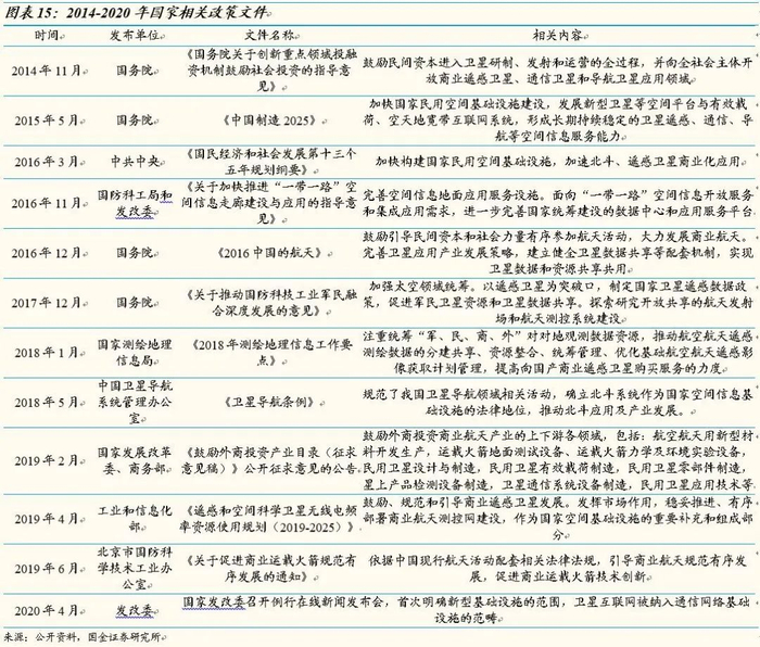 2014商业航天政策门槛打破,国内商业航天开始起步。我国商业航天发展停滞不前,主要原因是缺乏明显政策支持鼓励,存在审批程序复杂冗长、行业准入资质限制、配套资源限制多方面问题。2014年国务院出台了《关于创新重点领域投融资机制鼓励社会投资的指导意见》首次提出鼓励民间资本参与国家民用空间基础设施建设。鼓励民间资本研制、发射和运营商业遥感卫星,提供市场化、专业化服务。引导民间资本参与卫星导航地面应用系统建设。自此,商业航天政策门槛逐渐被打破,商业航天全产业链逐渐发展。