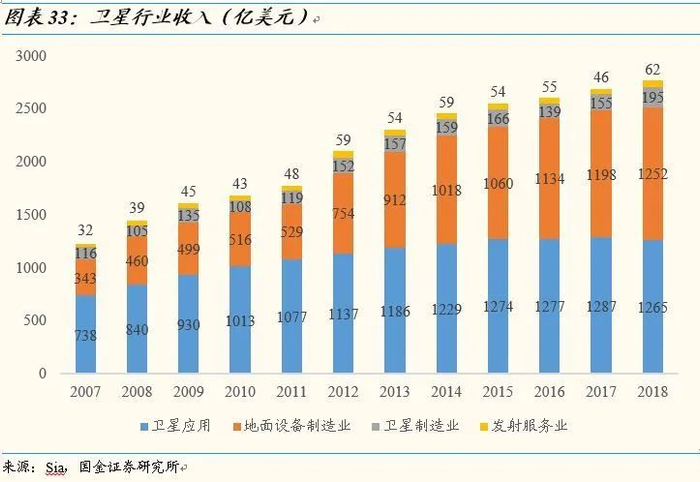 卫星应用和地面设备制造占产业链价值90%。卫星行业产业链自上而下清晰分明,上游是材料、燃料、电子元器件等原材料企业,中游是卫星研制、卫星发射和地面设备制造等高端装备制造商,下游为卫星运营和卫星应用商。据美国卫星工业协会(SIA)数据显示,2018年卫星行业产值为2774亿美元,其中子板块卫星应用产值1265亿美元、地面设备制造1252亿美元,两者合计占比超90%。另卫星制造产值195亿美元,卫星发射62亿美元,占比约10%。