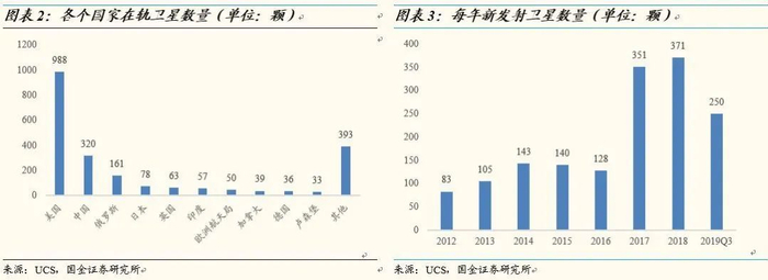 全球在轨卫星数量美国最多,2017年卫星发射提速。根据忧思科学家联盟的数据,截至2019年9月25日,全球在轨卫星总数为2218颗,美国在轨卫星最多为988颗。中国超越俄罗斯位列第二,在轨卫星数量高达320颗。从全球每年新发射卫星数量来看,受益于小卫星发展,从2017年开始全球进入卫星加速发射时期,2017年和2018年新发射卫星数量都超过350颗,2019年前3季度卫星发射数已达250颗。