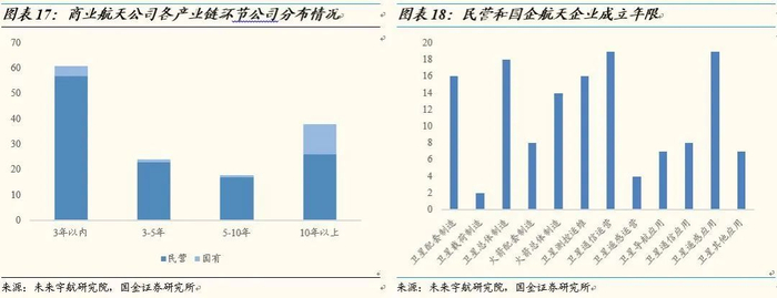 从中国航天“国家队”主导到民营企业蓬勃,产业链公司布局完善。2015年以前,中国航天行业基本中国航天科技集团有限公司和中国航天科工集团有限公司主导,2015年之后随着政策放开,两大航天集团开始对民营卫星资源开发服务,民营企业陆续蓬勃起来。根据北京未来宇航空间研究院公布的《2018中国商业航天产业投资报告》数据,截至2018年年底,国内已注册的商业航天领域公司有141家,其中民营航天企业123家,占比87.2%。航天产业链上下游皆有公司布局,其中卫星制造企业36家,卫星发射企业22家,卫星运营企业39家,卫星应用企业44家。从国有航天企业和民营航天企业的成立年限上看,国有控股企业大多成立时间较久,其中成立10年以上的居多。而民营航天企业的数量在近几年迅速攀升,仅三年内成立的民营航天企业就达到57家。我国鼓励民营航天发展的政策初具成效,迅速发展起来的民营商业航天公司可作为这些国有商业航天公司的有力补充,航天产业链完备。