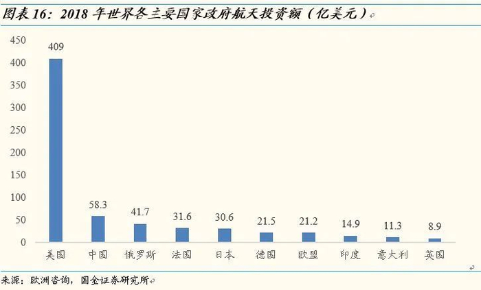 政府直接投资,扶持商业航天领域发展。根据知名航天咨询公司欧洲咨询(Euroconsult)发布的《政府航天计划:基准、剖面与2028预测》中对2018年世界各国政府航天投资情况分析,中国政府航天投资额位列第二,2018年投资数额达58.3亿美元。航天行业是资金密集、技术密集型行业,我国商业航天发展不到五年的时间,需要大量资金的投入。近年来我国政府在航天领域的投资逐年提升,目前已稳居世界第二。