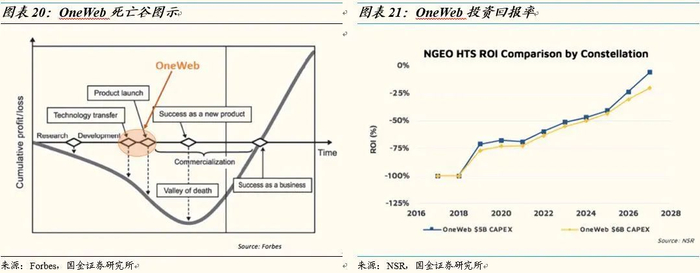 航天企业越过死亡谷,资金储备是关键。死亡谷,是创业企业在获得正向现金流之前的一段盈亏曲线。根据加拿大北方天空研究公司(NSR)在2018年9月推出一份报告, OneWeb死亡谷的谷底应该是出现在星座部署完成,以及终端全球铺货完成的时刻。现在的一网公司处在星座部署早期,盈亏曲线正在继续向负值方向下滑。NSR对OneWeb的资本性支出测算,认为OneWeb星座CAPEX可能达到60亿美金,在这种预设下OneWeb在2027年都无法实现盈亏平衡。截止到2019年Q3,OneWeb已融资32.5亿美元,但依然无法负荷卫星行业的高额投资。2020年3月,OneWeb宣布申请破产,计划进行业务出售。
