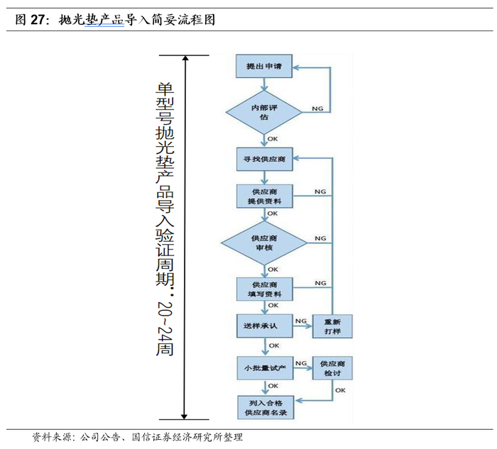 核心客户认证体系壁垒较高,主要由于抛光垫对芯片良率影响较大,但成本占比较相对较低,在稳定而成熟的FAB厂中,为确保芯片良率,一般很少替换原有稳定的供应商。半导体Fab厂具有资本密集和技术密集的属性,对于上游半导体原材料的稳定性和良品率有极高的要求,因此对于原材料供应商认证门槛极高、认证周期较长。目前在半导体产业链安全可控的大环境下,国内厂商速度加快,验证周期缩短到半年左右。