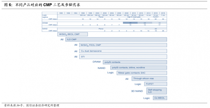 CMP主要运用在在单晶硅片抛光及多层布线金属互连结构工艺中的层间平坦化。集成电路制造需要在单晶硅片上执行一系列的物理和化学操作,同时随着器件特征尺寸的缩小,需要更多的生产工序,其中90nm以下的制程生产工艺均在400个工序以上。就抛光工艺而言,不同制程的产品需要不同的抛光流程,28nm制程需要12~13次CMP,进入10nm制程后CMP次数将翻倍,达到25~30次。