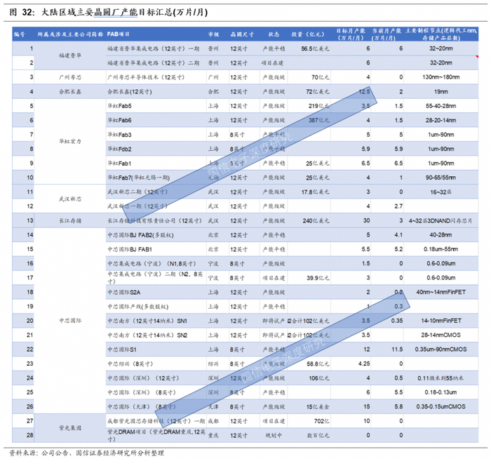 未来3-5国内晶圆制造产能将翻番,国内半导体产业链上下游迎来重要契机。根据我们对于大陆区域晶圆制造的全面梳理,目前大概有54个运营主体,共计94个晶圆厂或产线项目,目前产能平稳运行的有17个晶圆厂及产线项目,正在产能爬坡的有37个,未来3-6个试生产的11个,正在项目基础建设的9个,另外正在规划的约11个。