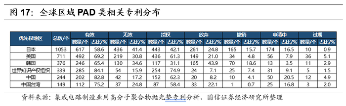 日本、美国在抛光垫领域技术积累较厚实,中国排名第5。据《集成电路制造业用高分子聚合物抛光垫专利分析》一文统计,截至2017年,在全球2918个专利中,有效专利约1511个,而其中日本有效专利占比达41%,美国有效专利占比达33%,分别位居第一第二,中国近年来有所提升,有效专利数占比达16%。