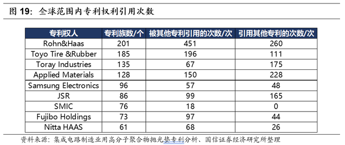 海外抛光垫龙头企业罗门哈斯(被陶氏收购)拥有较多和CMP PAD相关的高质量及基础专利。截止2017年9于月,通过代表专利质量指标的引用次数指标显现,罗门哈斯的专利被引用次数在全球范围内所有申请人中最多,达451次,其总计拥有201个抛光垫的设计和制造方面的专利族,154个抛光垫在抛光方面的应用专利,123个抛光层方面的专利族,8个抛光垫表面的专利族。