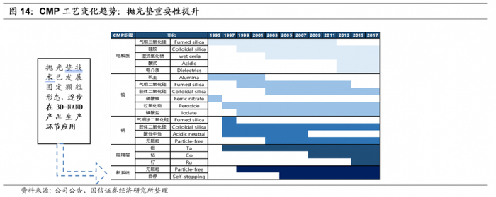 目前最新趋势,国际先进厂家在3D-Nand等更高要求的生产环节中应用固定研磨颗粒的抛光垫,其产品融合了原本存在于抛光液的抛光颗粒,显现抛光垫重要性进一步提高。