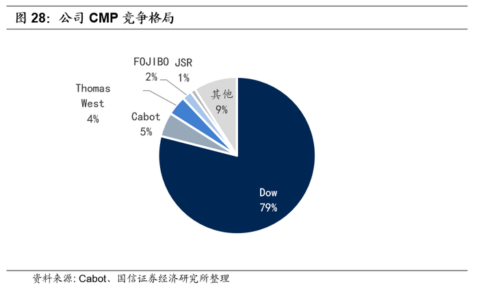 Dow垄断中国近90%的CMP抛光垫市场供给,是国产替代的主要对象。Dow是一家全球领先的化学公司,其CMP抛光垫业务来源于对Rodel的并购。Dow侧重 CMP 本身机理研究,改进抛光机制和抛光垫参数,并根据客户的实际需求从应用层面对现有产品进行改良,目前有多种型号 CMP 抛光垫供应亚太、欧洲和北美市场。2005年Dow开始布局亚太地区,2008年全线投产,是CMP抛光垫领域的绝对龙头。