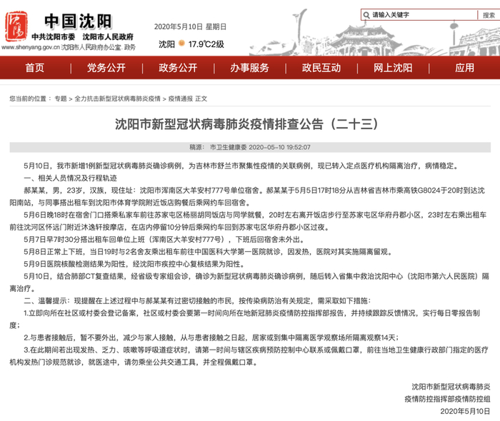 5月10日,结合肺部CT复查结果,经省级专家组会诊,确诊为新型冠状病毒肺炎确诊病例,随后转入省集中救治沈阳中心(沈阳市第六人民医院)隔离治疗。