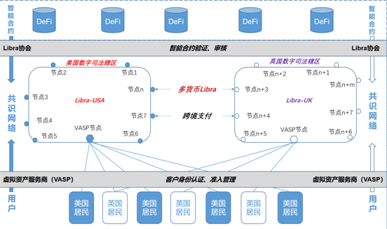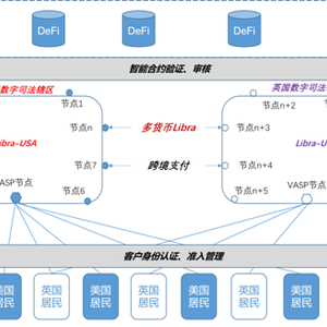 6.跨国资本流动管理。Libra的技术特性模糊了“离岸”与“在岸”的边界,容易对跨境资本流动管理框架形成冲击。笔者曾建议“各国监管部门根据客户的数字身份归集本国居民,划定数字司法辖区。本国居民与非本国居民的金融业务和资金往来,由各国监管部门按照各自的资本账户开放和跨国金融监管政策进行规制。本国居民之间的金融业务服从各国的KYC、AML/ATF及各类金融监管规则。由此,政府就不用担心跨境宏观审慎管理和金融监管的失效”。Libra2.0白皮书将单货币Libra用于国内交易,而多货币Libra仅用于跨境交易,且多货币Libra是由单货币Libra抵押通过智能合约组合生成。这其实划出了在岸与离岸的边界。虽然它没有给出具体如何操作,但结合其对钱包地址的管控,如分类管理、尽职调查、阻止制裁地址交易,可推测其思路或与笔者建议大逻辑一致,即通过钱包地址和数字身份归集本国居民,划定数字司法辖区,开展跨国资本流动管理。见下图。