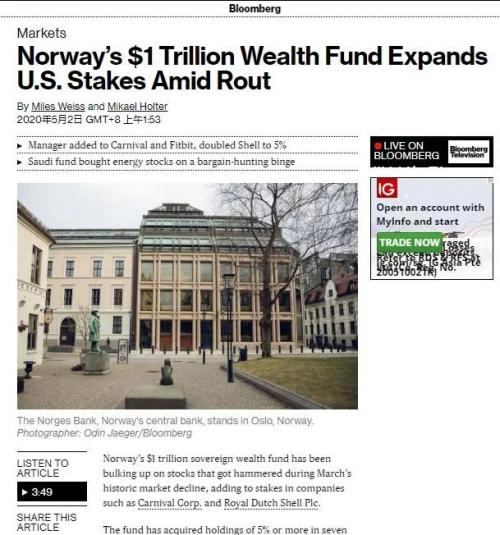 彭博对此写了一篇报道称:挪威规模达1万亿美元的财富基金在溃败中加大了对美国的赌注:比如说买入了$嘉年华邮轮(CCL.US)$和$Fitbit(FIT.US)$(都在一季度申报),持有的荷兰皇家壳牌石油公司B股达到5%披露比例,而且挪威基金和沙特财富主权的基金都加注壳牌和嘉年华,这似乎都在透露看好两只股票长期发展的信号。