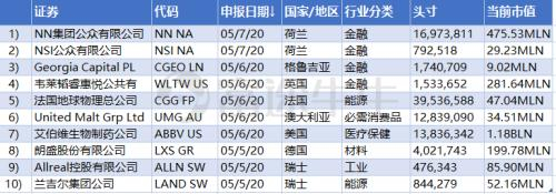 然而上述股票有的申报得比较早,我们再来看看在一季度之后的4月和5月(截至5月10日),共申报了275只股票,最新申报的:在阿姆斯特丹上市的NN集团和NSI公众有限公司、伦敦股票Georgia Captial PLC和美股$Willis Towers Watson PLC(WLTW.US)$都是金融股。