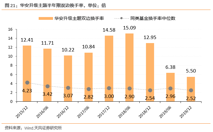 整体来看,华安升级主题与同类基金相比换手率偏高,基金平均半年期双边换手率约11.1倍左右。