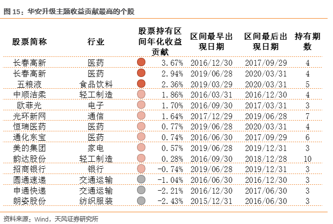 下图对基金在年报、半年报和季报所公布过的所有持股信息进行了汇总,假设基金对每只个股在财报公布日开始持有,保持至个股连续出现最晚时点的下一季度末,计算区间内个股持仓的年化收益贡献。以下罗列了在持仓假设下基金持有时间最长的15只个股,以及在财报中出现两次以上且年化收益贡献最大的个股。可以看到华安升级主题中持有时间最长的15只个股中有10只个股收益贡献为正,基金具有优秀的长期选股能力。