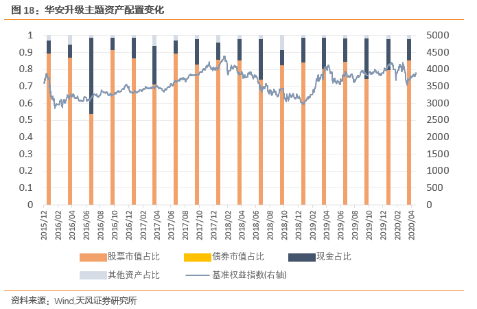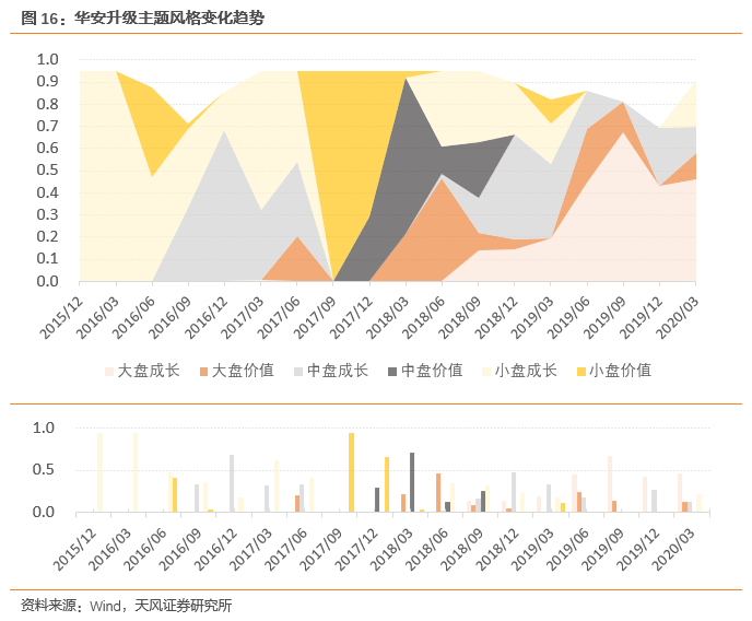可以看到,自有效起始日期以来,华安升级主题风格变化较为灵活,2017年中之前基金配置以成长风格为主,2017年中期开始基金对价值风格的配置逐渐加强。2018年中期开始基金对成长风格的配置逐渐加强,对价值风格的配置逐渐减弱。