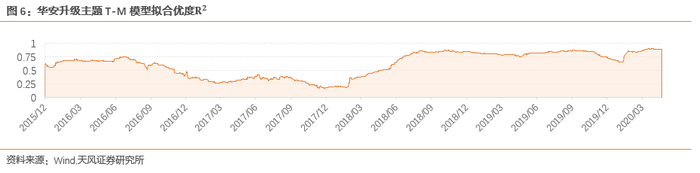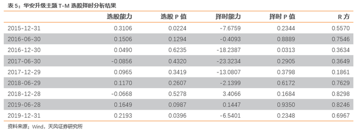 根据T-M模型的分析结果,华安升级主题在2015年、2016年以及2019年3月至今展现了显著的正向的选股能力,2018年三季度至2019年9月期间展现了正向的择时能力