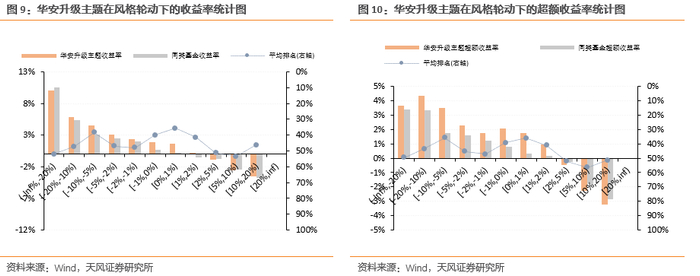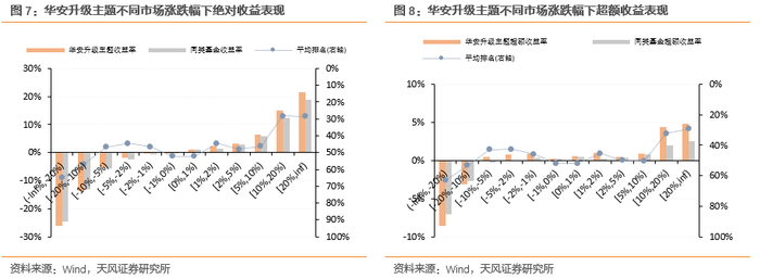 根据图7以及图8,华安升级主题自有效起始日期以来,表现整体优于同类基金平均水平,当市场20日涨跌幅达到10%以上的情况下,基金表现尤其出色,同类同期排名可上升至前30%左右。