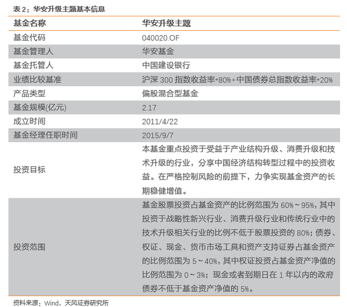华安升级主题(040020.OF)成立于2011-04-22,偏股混合型基金。饶晓鹏先生自2015-09-07开始接管该基金,截止2020-03-31,基金规模约2.17亿。