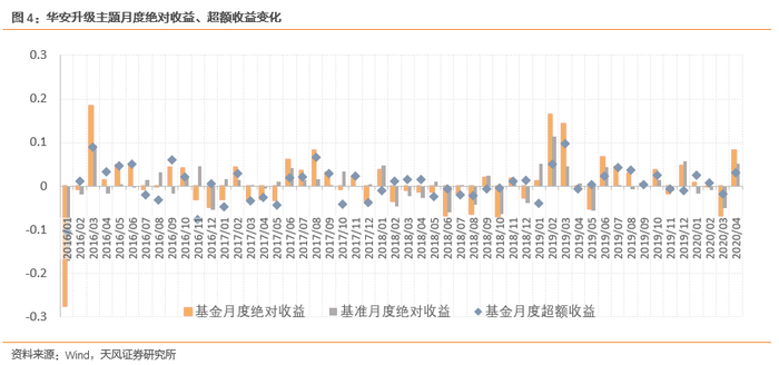 分月来看,华安升级主题在52个月中有30个月跑赢基准,月度胜率为57.7%。根据基金月度绝对收益、超额收益的变化可以看出基金具有持续地获取超额收益的能力。