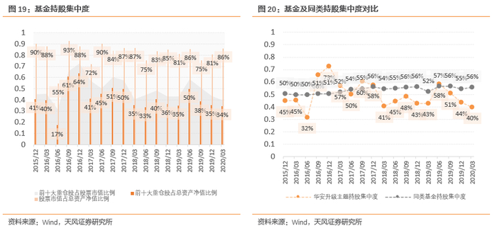 可以注意到华安升级主题持股集中度偏低,约有46.8%左右的股票持仓集中在前十大重仓股,低于同类基金54.4%左右的中位数水平,2020-03-31基金股票持仓中约有39.9%的比例集中在前十大重仓股。