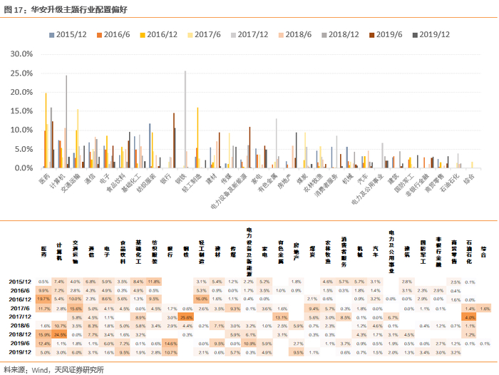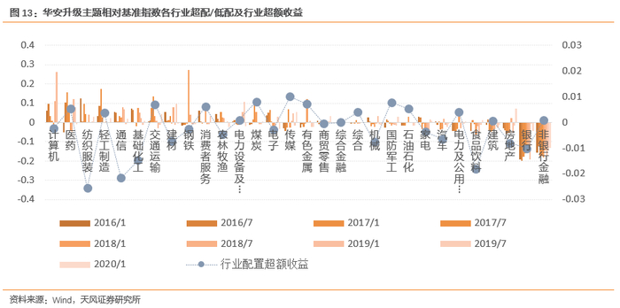 通过下图我们可以看到,华安升级主题在计算机、医药、纺织服装以及轻工制造、通信等行业的整体配置高于基准,基金各期超配行业均有所变化,具有一定行业轮动的特点。此外可以注意到,基金对非银行金融、银行以及房地产行业长期处于低配状态。对基金行业配置超额收益贡献较高的行业主要为传媒、煤炭、国防军工以及有色金属等行业。