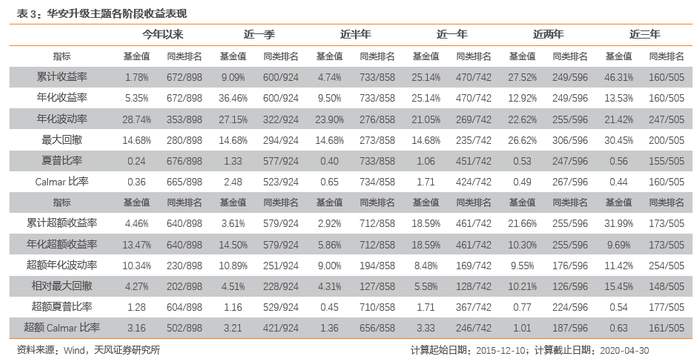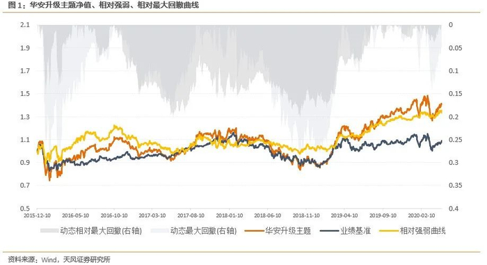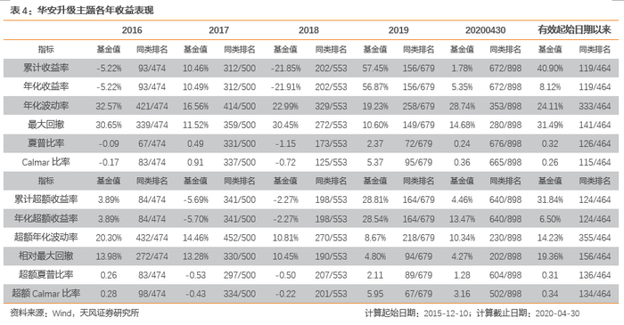 考虑基金接管之后的建仓期间,对新接管基金的基金业绩有效起始日期修正为基金接管日期的3个月之后。通过统计在各个阶段基金的收益情况,可以看到基金业绩管理能力突出。华安升级主题有效起始日期2015-12-10至2020-04-30,基金年化绝对收益8.12%,同类基金排名119/464(前25.6%),年化超额收益6.50%,同类基金排名124/464(前26.7%);同时,基金最大回撤为31.49%,位于同类基金的后30.4%,相对最大回撤为19.36%,排名位于同类基金后33.6%,基金对回撤的控制能力较为出色。有效起始日期以来,华安升级主题以同类基金排名后30.4%的最大回撤,获取了同类基金排名前25.6%的绝对收益。