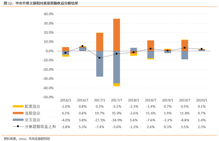 可以注意到,在各个年报\半年报时间节点附近,华安升级主题相对基准的超额收益主要由选股效应带来。