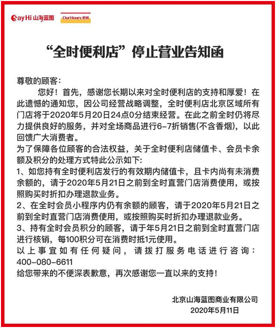 据媒体5月11日报道,全时便利店已经通知此前合作的几大供应商,暂停继续向其供货,而对于此前合作还未到货款账期的,全时也并未给供应商结算货款。同时,有工作人员透露,由于母公司资金链断裂,京津区域内所有全时门店将全部撤店。